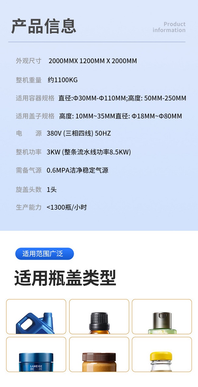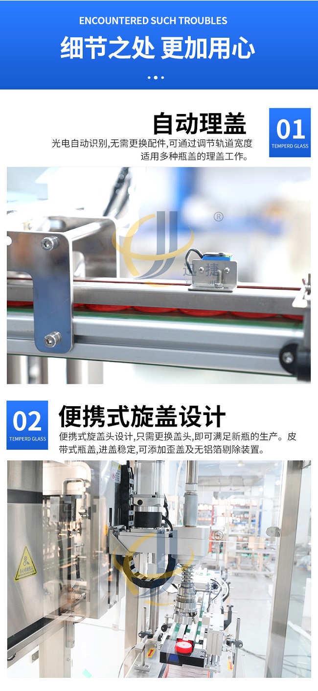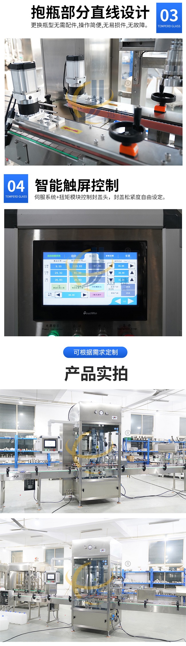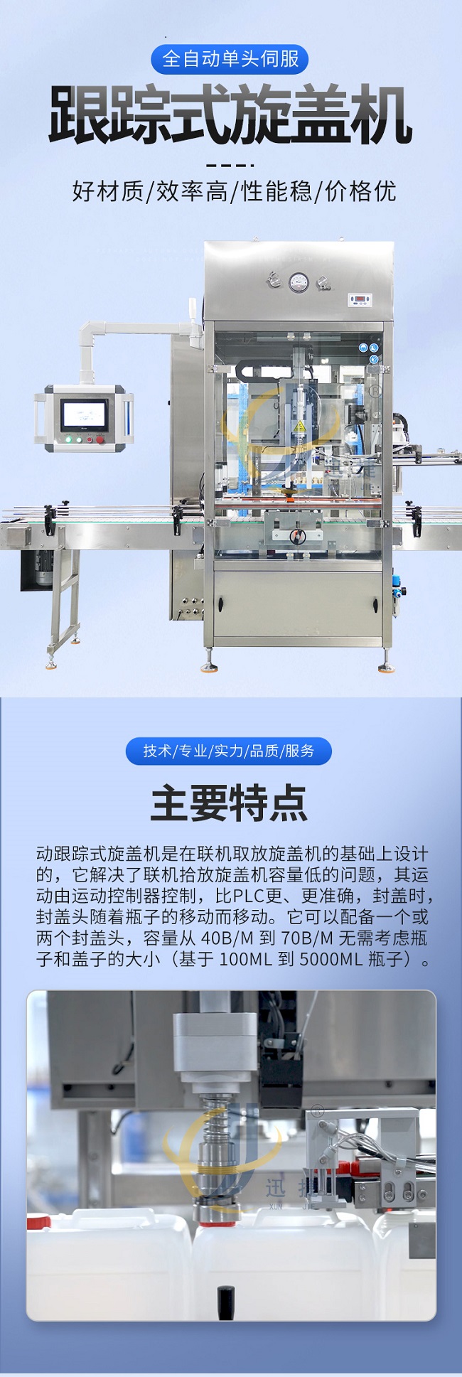 跟蹤式旋蓋機(jī)是在聯(lián)機(jī)取放旋蓋機(jī)的基礎(chǔ)上設(shè)計(jì)的,它解決了聯(lián)機(jī)拾放旋蓋機(jī)容量低的問題,其運(yùn)動(dòng)由運(yùn)動(dòng)控制器控制,比PLC更、更準(zhǔn)確,封蓋時(shí),封蓋頭隨著瓶子的移動(dòng)而移動(dòng)。它可以配備一個(gè)或兩個(gè)封蓋頭,容量從 40B/M 到70B/M 無(wú)需考慮瓶子和蓋子的大小(基于 100ML到5000ML瓶子)。