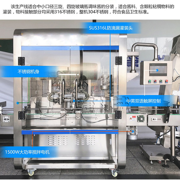 該機(jī)為雙頭辣醬灌裝機(jī),配有自動(dòng)攪拌功能,使物料混合更加均勻 ,有效的解決灌裝誤差大的問題;雙頭辣醬灌裝機(jī)輔料添加料可調(diào),精準(zhǔn)方便,提高自動(dòng)化程度。 雙頭辣醬灌裝機(jī)氣動(dòng)部分均采用知名氣動(dòng)元件,壽命長,穩(wěn)定。 物料接觸部分采用SUS316L不銹鋼材料制成,符合食品醫(yī)藥安全衛(wèi)生要求。 灌裝閥由氣動(dòng)閥控制,灌裝精度更高。 這款雙頭辣醬灌裝機(jī)幫您解決醬會(huì)堵塞的問題